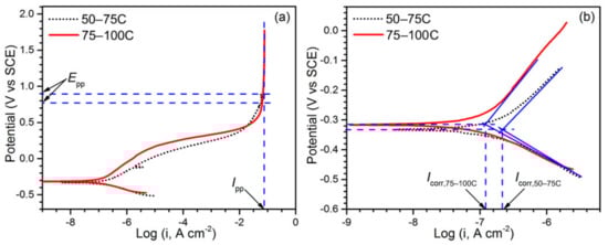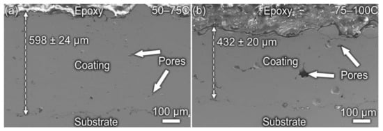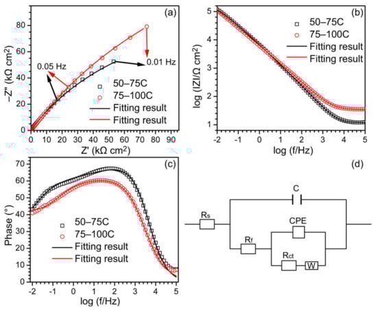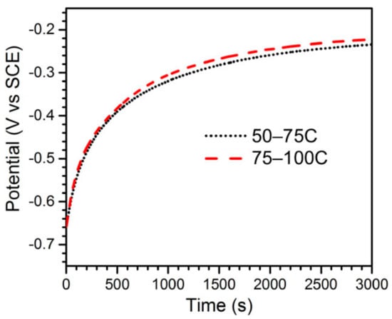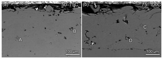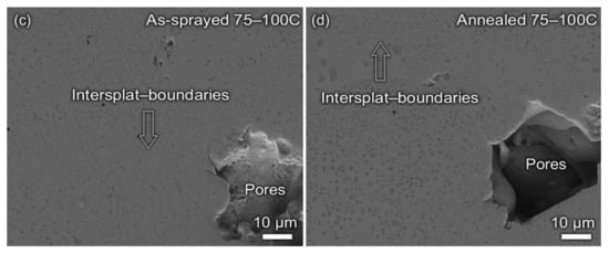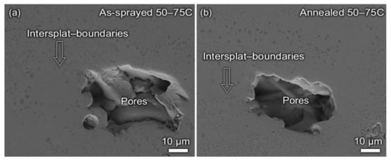 - Due to the smaller powder used, a greater number of non-bonded boundaries are present in the as-sprayed 50–75C, leading to the easier penetration of corrosive media. Therefore, the as-sprayed 50–75C has higher corrosion current density (0.254 ± 0.062 μA/cm2) than the as-sprayed 75–100C (0.189 ± 0.069 μA/cm2). Correspondingly, the charge transfer resistance of the as-sprayed 50–75C (0.37 ± 0.07 MΩ cm2) is also lower than that of the as-sprayed 75–100C (0.50 ± 0.07 MΩ cm2).