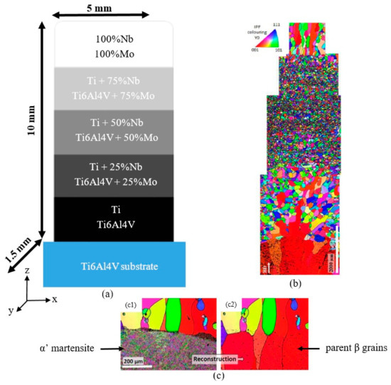 The microstructure features of the different graded materials in their as-deposited states has been detailed previously [34,35]. The main features are just recalled in Figure 1b,c for the sake of clarity. The evolution of the microstructure, and in particular the parent grain morphologies after a reconstruction from the martensitic ’ variants, is illustrated in Figure 1b,c. The evolution of the microstructure for the Ti-Nb and TA64-Mo walls shared a number of aspects and the features shown in Figure 1b,c for TA64-Mo pertain for the other FGM sample. Because of the fast cooling rate [34,35], the initial layers of Ti or Ti6Al4V were characterized respectively by a Widmanstätten or a martensitic α’ microstructure, issued from the high temperature parent phase nucleated from the melt (Figure 1c). With the addition of Nb or Mo, the microstructure became beta equiaxed with a decreasing grain size as the alloying element amount increased (Figure 1b). In the pure Niobium (Nb) or pure Molybdenum (Mo) layers, the beta grains were columnar parallel to the z axis (deposition axis).
