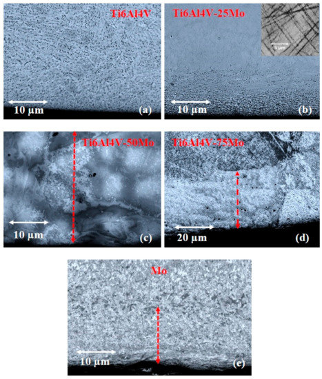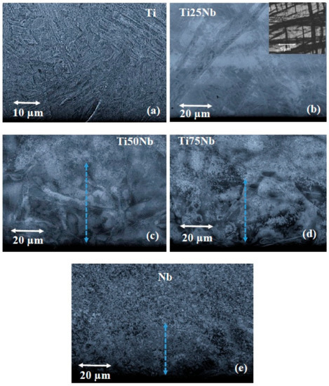 Figure 2 and Figure 3 give SEM images showing details of the microstructures after the application of the SMAT process. In Ti and Ti6Al4V as well as at the lowest amount of additions (25% of Mo), the top surface microstructure was refined over a depth of the order of 5 to 15 μm. This is particularly visible in Figure 3a,b where the grains are refined and equiaxed near the surface while elongated grains are visible at the sub-surface. In addition, for the initial structure, kink bands appeared in the subsurface over significant thicknesses (>200 μm). This type of kink band has already been observed in highly alloyed beta titanium alloys during deformation at high speed rate [41]. The width of the zone where these kink bands were present was thicker for the case of the Nb addition than for the Mo one (Figure 2b and Figure 3b). Indeed, the kink bands reached the surface for the Ti-25Nb alloy, whereas for the Ti6Al4V-25Mo alloy, the nanostructured layer was present from the surface towards 15 μm below the surface (Figure 3b). From 50% of alloying elements, the kink bands disappeared and the contrast visible within the beta grains at the SMATed surface witnessed strong internal misorientations. Figure 2c–e and Figure 3c–e show that the thickness of this layer depends on the amount in alloying element. A comparison of the blue and red arrows in Figure 2c–e and Figure 3c–e indicates, however, that its thickness is equivalent for both the Ti-Nb and Ti6Al4V-Mo alloys at a given amount of alloying element.