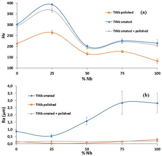 Figure 4 shows the evolution of the hardness and roughness before and after the different SMAT and SMAT + polishing treatments for the Ti-Nb wall. For the polished sample, the maximum hardness was reached for 25% of Nb (Figure 4a). According to the literature [42,43], this increase is due to the presence of a small fraction of ω-phase, especially when the composition is around 25% Nb. The amount of omega phase was increased by the successive remelting and tempering from the successive layer by layer deposition generated by the DED-CLAD process. This tempering promoted the formation of the ω-phase, which explains the increase in the microhardness, as was also observed for TiMo alloys [44].