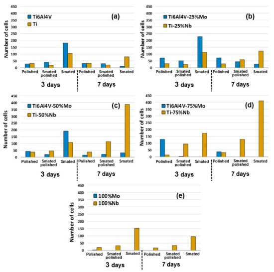 In the case of pure elements, as no cells adhered or survived for all conditions of pure Mo, Figure 5e demonstrates the toxicity of pure Mo and the better biocompatibility of Nb.