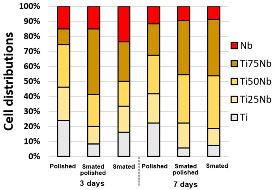 The comparison between Figure 4b and Figure 6 demonstrates that, for the SMATed samples, the adhesion was preferentially done in the gradients where the roughness was important (75 and 100% of Nb). For the same roughness (P and S + P samples), the cells seemed to be randomly distributed. After seven days, the distribution trended to be the same for all samples but the nanostructured microstructure decreased the time needed to reach the distribution equilibrium. This indicated that the microstructure modification (dislocations cells, finer grains, etc.) induced by severe plastic deformation only played a role just after adhesion, at the early stage of proliferation.
