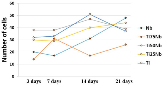 As demonstrated in Figure 5, the cells could not proliferate for the Mo containing sample and even not adhere at high Mo concentration, so only the Nb containing sample were investigated in term of cell proliferation. Figure 7 presents an example of the number of cells after three, seven, 14 and 21 days in the polished TiNb sample for the same donor. Figure 7 shows that if the total number of cells increased during the 21 days, the proliferation depended on the composition. Niobium had the fewest cells in the first week but then became the location in the gradient where proliferation was the most important. Thus, after three weeks, it became the best material with the highest cell number. Despite the fact that niobium was not used as such in prostheses because of its mechanical properties that were too far from those of the bones (higher Young modulus) [51], this test demonstrated the perfect biocompatibility of pure niobium [50]. In addition, this type of test validated the fact that FGM can be used successfully in biocompatible experiments to decrease the number of needed samples for long term proliferation test.