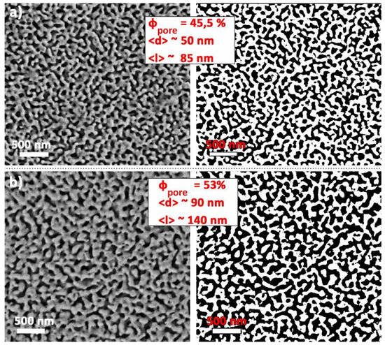 SEM (scanning electron microscope) secondary electron images of a nanoporous (NP) material and corresponding threshold patterns as a binary generated image: (a) NP1, dealloying time of 45 min and (b) NP2, dealloying time of 3 h.