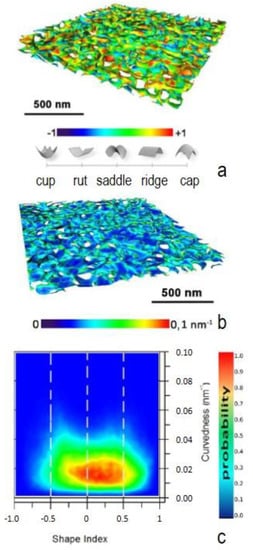A FIB tomographic image of a nanoporous silver similar to NP1 and NP2 showed the microstructural complexity in terms of morphological and topological characteristics. This type of analysis provided us with the local surface shape (Figure 2a) and curvedness level (Figure 2b), and from them a surface shape–curvedness statistical distribution (Figure 2c). This was a useful structural function of the material for properties analysis (shape index and curvedness are calculated from the principal curvatures and )