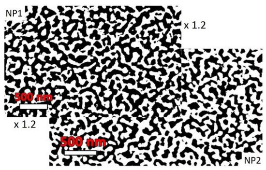 However, to help in our work, simple visual comparison was made between NP1 and a rescaled NP2, though differences in porosity did not allow for full adaptation. The scaling factor used was the ratio between different porosities, and the superimposition in Figure 3 makes a convincing case for near-similarity, at least on the 2D SEM images.