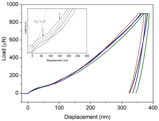 With a probe (indentation tip) size in the order of the length scale of the cellular microstructure, interpretations and quantitative analyses from the nanoindentation of nanoporous materials were challenging and subject to debate. Preliminary studies were undertaken to evaluate these length–scale issues. A series of more than 50 nanoindentations in quasistatic condition were performed on NP1 and NP2. A selection of 4 different indentations taken from the NP2 series and compared with a bulk silver sample were as seen in Figure 4. Every loading curve (see the inset of Figure 4) exhibited 2 successive extended bumpy regions (diffuse serrations).