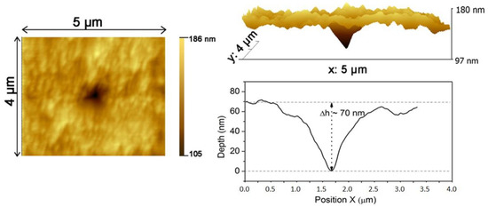 Scanning probe microscopy of the surface, and profile image of the slow-rate quasistatic indent, which reached a final depth of 70 nm after elastic relaxation.