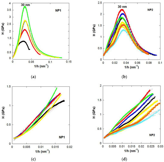 The depth dependence was investigated using the DMA mode of the indenter, allowing us to keep an ongoing measurement of the hardness as a function of depth. In Figure 6a,b, the overall plot of as a function of showed a maximum value at about 30 nm, which was of the order of the lower limit for a relevant measure due to tip imperfections (Figure 6a,b). as a function of was suggested as the best linear plot for the test series seen in Figure 6c,d. For larger than 40–50 nm, which corresponded to the upper part of the bumpy region, the data are plotted Figure 6c,d for NP1 and NP2, respectively. From the linear fit, hardness at a hypothetical infinite indent size () when none were affected by size effect was obtained respectively for NP1 and NP2, = 58 ± 10 MPa and = 163 ± 18 MPa. The slope () related to the size-effect sensitivity informed other deformation dynamics of the NP metal: = 67 ± 8 GPa·nm and = 47 ± 15 GPa·nm for NP1 and NP2, respectively.