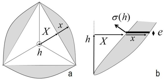 Scheme of a Berkovitch indent with the strained zone denoted in grey. (a) Top view, (b) cross-section view of a third of the indent. The parameters used in this modeling are as shown: indent shear applied at height , and the resulting shear displacement of an NP infinitesimal thickness . was the resulting back stress produced at height from the strain gradient.
