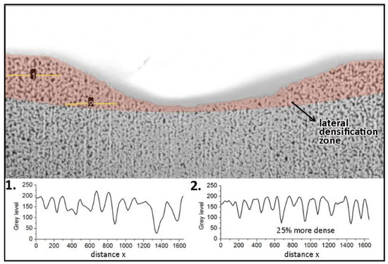For highly porous materials made of plastic ligaments, densification was the main deformation mechanism when compressed. In this way, the strain gradient could be readily attributed to the variation in densification along the indent surface. This assumption was verified qualitatively by cutting an indent using the FIB technique and analyzing ligament distributions at various heights. This was imaged by plotting the greyscale distribution, along with a line scan for two different zones of the indent (Figure 8). We observed that the frequency of the greyscale variation was larger at more profound locations than when compared to the zone just below the sample surface.