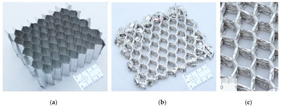 The hereby discussed thin-walled aluminum honeycomb is made of a 3000 series aluminum alloy. This alloy group, particularly suitable for sandwich panel assemblies, is easily machined and formed having a low-cost production. The structure’s compressive stabilize strength may vary between 0.85 and 7.7 MPa depending on the wall thickness, cell size and structure density [28]. The tested honeycomb is manufactured by bonding together thin, corrosion-resistant sheets of aluminum foil, which are then expanded to form a cellular hexagonal configuration. According to the producer, the structures have the generalized cell size described by a diameter of 12 mm and the thickness of a single wall of 70 μm, which results in a density close to 40 kg/m3 [28]. The structures subjected to the tests had a height of 50 mm and consisted of 7, 19 and approximately 53 cells (Figure 1a).