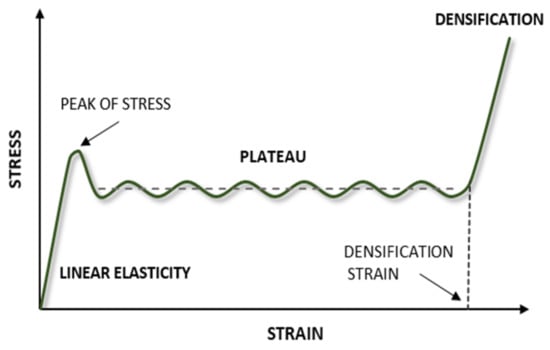 The generalized stress–strain curve representing the response of a metallic cellular structure to a compressive load.