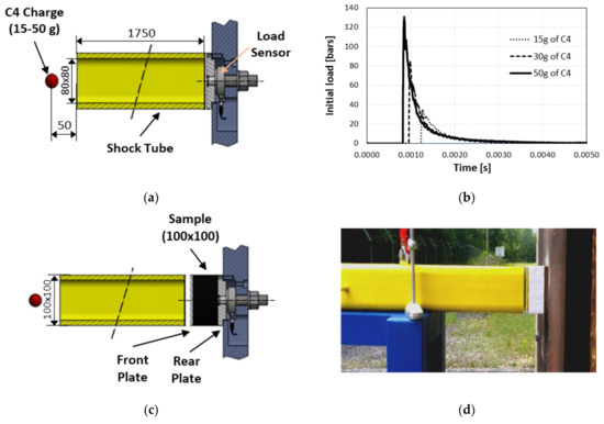 Understanding the performance of structures and materials under a blast loading is crucial to improving the efficiency of protective shields and, therefore, to increasing the survivability of personnel and equipment endangered by explosions. When a high-energy charge explodes, a large amount of energy is generated in a small, localized volume. A distinctive shock front spreads through media with a velocity higher than the local sound speed, causing changes in the pressure, temperature, density and particle velocities, thus creating an effect known as a blast wave [1]. Mechanisms of pressure wave propagation are complex, consisting of several physical phenomena such as a burning effect, heat transfer and air compression, which makes blast testing a challenging experimental technique [2]. Depending on the charge, its mass, its shape and its distance from the structure, different solicitations may be expected. These solicitations, along with the structure’s mechanical and geometrical properties, define the damaged caused by the explosion. The influence of an explosion on a structure may be analyzed experimentally by a few test techniques, such as a detonation in “free air” [3,4], or by means of shock tubes [5,6]. Free-air explosion tests are considered difficult in instrumentation and have limited repeatability, but they allow to study effects of interactions in real configurations of explosives and structures. On the contrary, traditional shock tubes are used mainly for academic purposes and generate shock waves in a more simple and safe way. Shock waves inside a compressed-gas-driven shock tube may be generated by a buildup of high pressures, which causes diaphragms to burst and a shock wave to propagate down the shock tube [6]. Since a shock wave is not representative of a blast wave, in order to enlarge the range of applications, shock tubes have been modified so that they could generate a blast wave instead of a shock wave. Recent examples of the application of classical shock tubes for this type of investigation can be found in papers [7,8,9], which provide experimental data and results of numerical modeling confirming the correct flow and pressure profiles. One of the main difficulties related to gas-driven shock tubes is the proper design and modeling of the fracture of diaphragms opening the flow. In explosive-driven shock tubes [10], a blast wave is obtained by an explosion of a charge located in front of the tube. The wave propagates inside the tube, creating a localized planar pressure front. Compared to a free-air detonation, the EDST is a test set-up used to generate and measure the effects of blast waves on a small scale/area. This technique, however, has a better replicability, enabling more accurate measurements of the pressure and impulse.