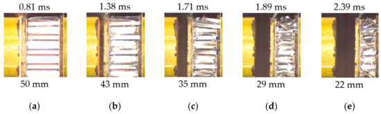 Subsequent frames depicting compression of the honeycomb during the explosive-driven shock tube (EDST) blast test: (a–e) Different decrease of the sample height (bottom row) and different recording time (upper row).