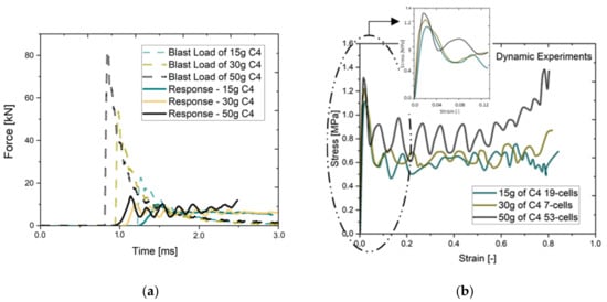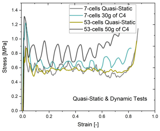 The comparison between the stress–strain curves resulted from the blast-induced compression and the quasi-static one is given in Figure 7. The stress–strain curves are calculated according to Equations (3) and (4). The structure responses resemble the idealized compression curve given in Figure 1. The characteristic phases of deformation are noticeable; however, not as distinctly as in the idealized case.