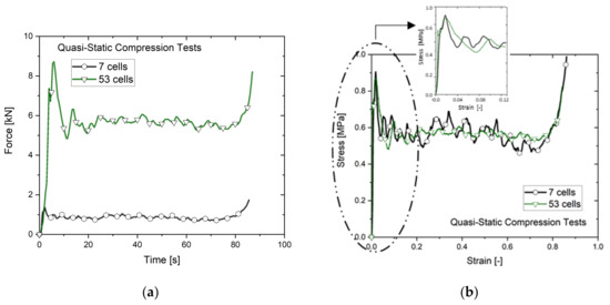 Compression tests in quasi-static conditions are performed to complete the overview of the behavior of the tested honeycombs under the axial loading. The 50 mm-height honeycomb structures with 7 and 53 cells are compressed by means of a universal testing machine Instron 5985 (Instron ITW, Norwood, MA, USA) with a constant strain rate of 0.01 s−1. The measured force–time curves and the resulted engineering stress–strain dependencies are given in Figure 6. It is observed that despite the difference in the registered forces, two structures with different numbers of cells are characterized by similar values of the peak stresses (about 0.9 MPa) and mean stresses (about 0.56 MPa), as seen in Figure 6b.