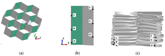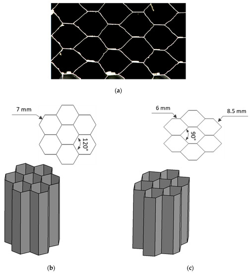 In the first approach, the honeycomb geometry is prepared basing on the network with the ideally dimensioned cells, here called “regular hexagon”, whose edge length is equal to 7 mm, as seen in Figure 9b. However, the real structure differs significantly from the assumed idealized one. In reality, the unit cell has two short and four long edges and a range of interior angles varies between 80° and 145°, as seen in Figure 9a. Differences in geometry lead to propose another cell pattern called “hexagon” (Figure 9c), in which a cell has 6 mm and 8.5 mm long edges and the angle between the two longer edges is 90°. The thickness of the ligaments remains as given in the product datasheet [28], i.e., 0.07 mm for single walls and 0.15 mm for double walls.