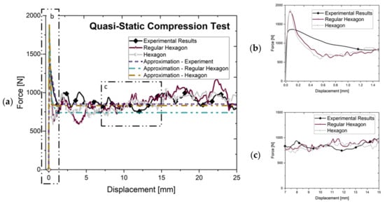 (a) The results from the implicit simulations with the regular hexagonal and hexagonal cells referenced to force results from the quasi-static experiment; (b) close-up of the peak of force; and (c) close-up of the results in the plateau range.