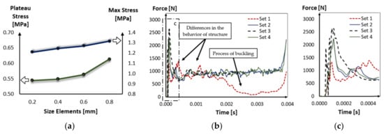 The important factor affecting numerical results is the size of mesh elements. The mesh study concerns the 7-cell structure compressed with the quasi-static strain rate. Basing on the simulations, it is observed that the coarse mesh with 0.8 × 0.8 mm2 can cause a difference up to 15% comparing to the result for the 7-cell structure meshed by 0.2 × 0.2 mm2 (Figure 11a). Calculations with the same solver and at the same settings show that when the mesh element is increased to 0.4 × 0.4 mm2, the same results accuracy is obtained but the task termination is reached three times faster than for the mesh with the half smaller element size.