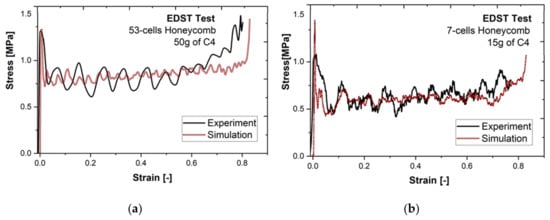 Comparison between stress–strain curves obtained in the simulation and in the EDST blast test for (a) a 53-cell structure compressed in detonation of 50 g C4 and (b) 7-cell structure compressed in the detonation of 15 g C4.