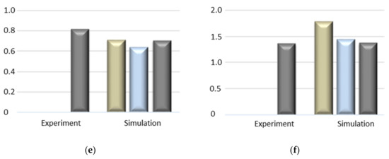 Comparison between the experimental and numerical mean and peak stresses characteristic for the structural responses to compression caused by the detonation of various masses of C4: (a) 15 g of C4, mean stress; (b) 15 g of C4, peak stress; (c) 30 g of C4, mean stress; (d) 30 g of C4, peak stress; (e) 50 g of C4, mean stress; (f) 50 g of C4, peak stress.