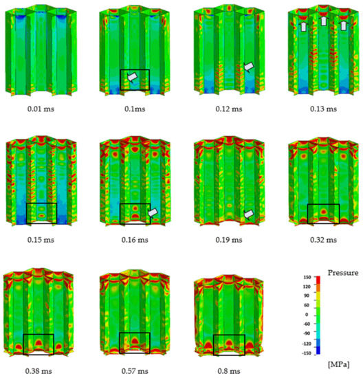 Figure 15 shows the honeycomb deformation with superimposed maps of the first invariant of the stress tensor (pressure) averaged over the shell thickness. In the early stages of compression, it may be observed that at the moment when the plate hits the structure, the induced stress propagates as a wave to the bottom (0.1 ms) where reflected, starts to travel back (0.12 ms) to the upper part of the honeycomb, where due to the contact with the plate, the structure is already partly strained (0.13 ms). The waves are further reflected and continue their travel again to the bottom part, where the stress concentrates (0.16 ms), forming the first fold. Since then, the deformation is localized behind the fold, which is followed by stress concentrations forming subsequent folds, bent “in” and “out” from the middle plane of cell walls.