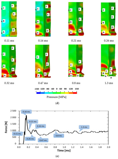The mechanism of fold formation may be analyzed closer by looking at the interior cell walls in Figure 16. Three points, A, B, and C on the double-wall (marked by green color), are indicated on the three first “bent-out” folds. Accordingly, for the single wall, points D, E and F are chosen. Different stress states that the elements undergo are visualized by the maps of pressure in Figure 16d. According to the schematic diagram shown in Figure 2, the first stage of deformation is characterized by an increase of force and elastic deformation of the walls of the honeycomb. During creation of the “A” fold, a local peak of force can be seen in 0.21 ms (Figure 16e). It indicates the beginning of the fold formation on a single wall; however, in the opposite direction than the “A” fold. The minimum force in this range indicates the maximum strains, common in two directions (bending “in” and “out”) and a starting point for the formation the second-level folds (marked by point “D”). After reaching the maximum force in this range (0.32 ms) the single wall is bending until the minimum force when the folds “B” (0.47 ms) and next “E” (0.7 ms) are starting to deform. In 0.8 ms, a new level of fold is occurring (fold “C” and next “F”) according to the schema described above. The process of creating the three first folds ends in 1.3 ms, when the fold “F” is formed.