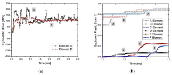 Figure 17 collects the graphs of the time evolution of the hydrostatic stress of the points A and D and of the equivalent plastic strain for all analyzed points. Numerous fluctuations are observed in the pressure curve featuring the complex elements loading paths and are slightly different for the two chosen points. At a certain moment (0.16 ms for A and 0.32 ms for D—Figure 17b), the stresses are concentrating which localizes a fold and causes a sudden increase of the plastic strain. The stiffer double walls are characterized by a higher limit for forces that can be applied without plastic deformation, therefore states of stresses on the yield surface are higher for point A than for D The evolution of equivalent plastic strain in time shows the order of fold formation: fold A (double wall) and then D (single wall) followed by the second folds B and E and, finally, C and F. Figure 17b indicates also that folds A, B and C are forming in a similar way, opposite to the folds on the single walls, which are less stiff and therefore may form a different size of folds.