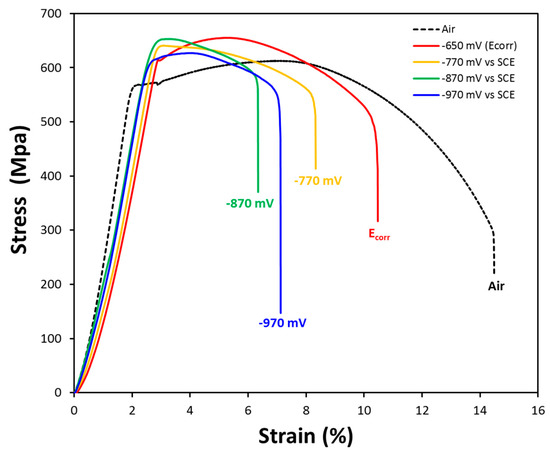 Stress-strain (σ vs. ε) curves of X70 pipeline steel immersed in NS4 solution (pH 3) at the Ecorr (−650 mV vs. SCE) under the application of different cathodic potentials.