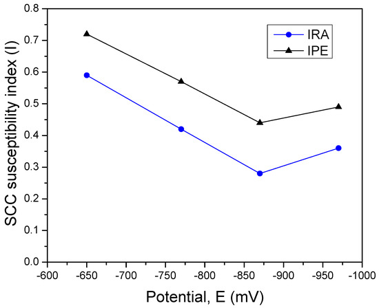 According to the indexes (IRA and IPE) shown in Figure 2, and to the classification proposed by McIntyre et al. [19], the X70 steel at Ecorr had moderate susceptibility to SCC, but when the X70 steel was analyzed with different Ecp, the steel exhibited great susceptibility to SCC.