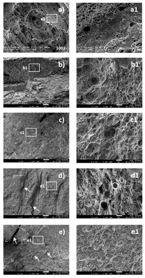 The X70 steel tested in air exhibited a ductile facture type, Figure 3a,a1. The same behavior was observed for samples tested at −650, Figure 3b,b1 and −770 mV, Figure 3c,c1. In these figures, the dimples produced by micro-plastic deformation can be observed, as well as the presence of micro-pores that can act as stress concentrators, with these sites being the typical places where cracking is preferentially generated. These micropores produce metal cracking by the coalescence mechanism [13,20].