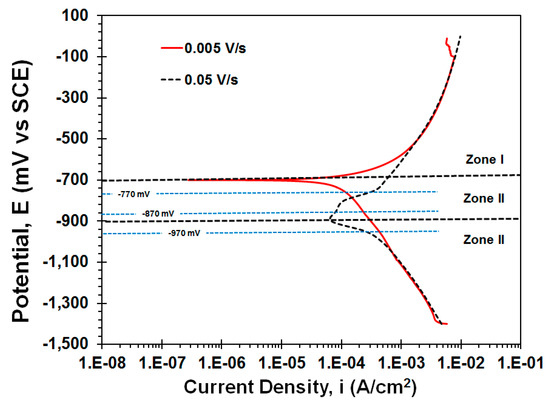 In addition, in Figure 5, it is possible to observe that the Ecp of −0.77 and −0.87 V vs. SCE are within zone II, while the Ecp of −0.97 V vs. SCE is located in zone III. Therefore, the behavior of the SCC susceptibility with respect to Ecp, as shown in Figure 2, can be attributed to the contribution of the anodic dissolution on the SCC mechanism. That is, when the potential is sufficiently negative, the anodic dissolution of the steel will be negligible and will not contribute to the SCC process, and this process will be dominated only by hydrogen embrittlement; on the other hand, at more positive potentials, even when the steel is under cathodic protection, in the area of tip of the crack, the steel will be in a non-stationary state and the anodic dissolution will contribute to the cracking process.
