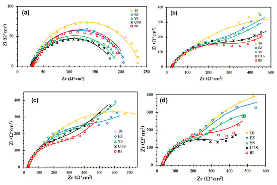 Figure 7b shows the EEC used to fit the EIS spectra obtained at the EZ, YS, UTS and RS points. In this figure, (Wz) is the semi-infinite diffusion Warburg impedance (Zw); in this case, the diffusion of the electroactive specie occurs when the mass transport is carried out from the bulk solution to the metallic surface in the absence of corrosion products [29,32]. When corrosion products are able to partially isolate the metallic surface, the study by Bastidas [33] defines the diffusion process for a layer of finite thickness using the transmission line model. Despite this model not being used in this research, it is important to note that this model is capable of providing a good analysis of corrosion. At Ecp of −0.97 V vs. SCE and at T0, EZ and YS, the EEC used is shown in Figure 7c [30]. In this EEC, it is possible to observe that an interface was adsorbed onto the metallic surface, and this can generate an electric response [30,34]. The parameter Ra is the adsorbed resistance and CPEa is the pseudo-capacitance associated with the adsorbed H. At the UTS and RS points, the EIS spectra were fitted with the Randles circuit.