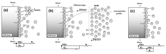 Figure 7 shows the EEC used to fit all of the EIS spectra in this research. All EIS spectra of the X70 steel obtained at the beginning of the test (T0) at Ecorr and at different Ecp, −0.77 and −0.87 V vs. SCE, were fitted with a simple equivalent electric circuit (Figure 7a), the so-called Randles circuit.