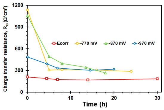 - At the Ecorr, all Rct values are lower than the Rct values obtained at any Ecp. This behavior indicates that the trend of the corrosion rate (CR) was affected by the applied cathodic potential, which prompted a decrease in CR; however, it is important to point out that the Ecp could improve the cathodic reaction, generating atomic H and increasing the susceptibility to SCC.