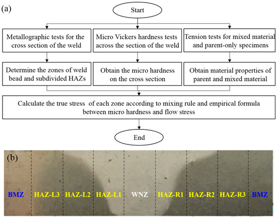 Determination of the material parameters in the weld zone (WZ): (a) flow chart; (b) sub-region division.