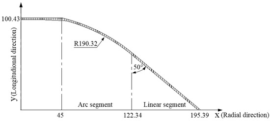 Figure 3 shows the schematic of the target curved head component. Its height in the y-axis is 100.43 mm, and the diameter of the large end is 390.78 mm. Its interior surface generatrix can be divided into two segments: the arc segment and the linear segment. The arc segment can be described by the following equation: