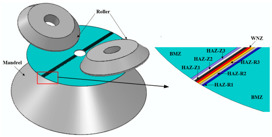 The FE model for power spinning of TWB was established using the ABAQUS/Explicit, as shown in Figure 4. The thickness and diameter of the blank are 2 mm and 400 mm, respectively. It is defined as deformable-body and discretized as four-node doubly curved thin quadrilateral shell elements (S4R). The whole blank is divided into WNZ, six HAZ sub-regions, and BMZ according to the division in Figure 1b. Their material models are assigned according to the data in Figure 2. The mandrel and roller are set as rigid bodies. The tie constraint is set between the blank bottom and mandrel to ensure that the blank can rotate with the mandrel. Coulomb’s friction model is applied to describe the friction behavior between tools and blank. After spinning, the ABAQUS/Standard module was used to simulate the spring-back process. The roller path is the typical shear forming path according to the law of sines and the other main processing parameters are given in Table 2.