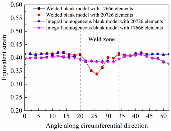It should be noted that due to the significant variation of the material model near WZ, reasonable element meshing is required to get high simulation precision and efficiency simultaneously. To this end, we proposed a meshing method, as shown in Figure 5. The WZ is locally meshed with 7 elements in the circumferential direction, which correspond to the WNZ and six HAZ, respectively. The radial side length of these elements are all the same. As for the BMZ, it is separated into four quadrant regions by the weld line and its perpendicular line. The same meshing method is applied to the four quadrant regions. For each quadrant region, it is subdivided into four annular regions and three transitional regions. The sweep method is applied to generate meshes in annular regions. While, the seed number increases from the interior to the exterior, which are coordinated by three transitional regions with free element meshing. The radial side length of the element in BMZ is the same as that in WZ. However, the circumferential side length of the element in BMZ increases gradually from the side near WZ to the side far away WZ, which is intended to guarantee the smooth transition from fine mesh to coarse mesh. It is well known that enough mesh number, i.e., enough small mesh size, is required to get higher simulation accuracy. To get a reasonable mesh number, we compared the simulation results at different mesh numbers to analyze the mesh sensitivity. Figure 6 shows the simulated equivalent strains (PEEQ) near the WZ of two models with 20,726 and 17,666 elements. In addition, two integral homogenous blank FE models with the same meshing method were also developed to check whether the meshing method will produce error itself. It can be found that the simulation results are very close to the two models with 20,726 and 17,666 elements. The simulated PEEQ at different circumferential positions are also very close presenting no mesh-dependence for the FE model of the homogenous blank. These indicate that the proposed meshing method and 20,726 elements are applicable to get reliable simulation results for the spinning of TWB in this work.