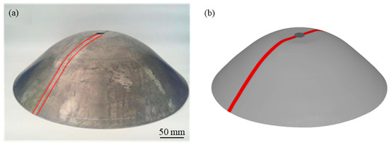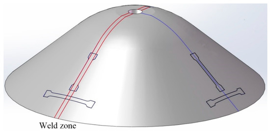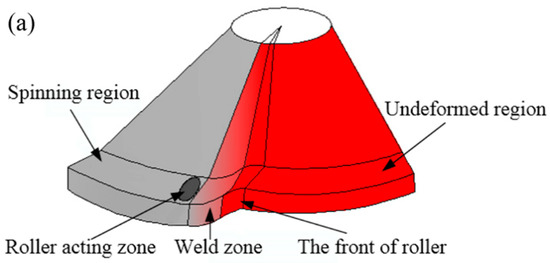 The surface heads of aluminum alloy are widely used as a key component for pressure vessels in the aerospace field to satisfy the high demand for performance, as they are lightweight, and are low cost. These components are usually formed by spinning technology, which has the advantages of low forming load, simple tooling, and high efficiency [1,2]. With the rapid development of high-end equipment in aerospace, the larger scale head component is growing in need. The diameter of the pressure vessel in the latest heavy-lift launch vehicle is greater than 5 m. However, it is difficult to obtain a high-quality integral blank with a large size in this order by rolling directly. This limits the high-performance spinning forming of large-scale heads. Fortunately, the development of welding technology, especially friction stir welding (FSW), has improved the weld quality of aluminum alloy effectively in recent years [3,4,5,6,7]. Thus, it may be a feasible way to form the aluminum alloy large-scale heads by the power spinning of tailor welded blank (TWB).