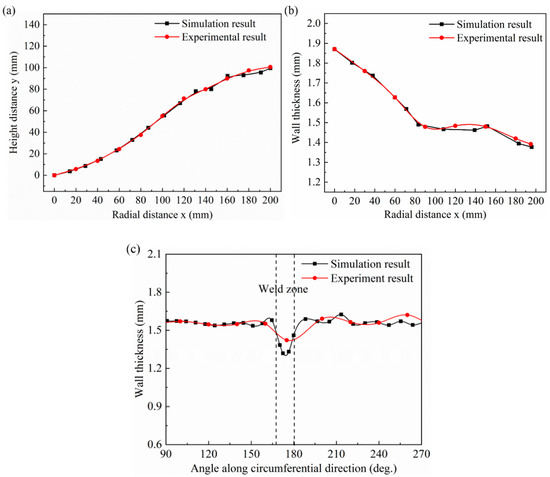 The spinning experiment at the conditions in Table 2 was conducted to verify the developed FE model, as shown in Figure 7. It can be found that the simulated workpiece shape closely matches the experimental result. In addition, the profile and wall thickness distribution of the formed components were measured, as shown in Figure 8. It can be seen from Figure 8a that the simulated profile agrees well with the experimental result. The average and maximum relative errors are 0.53% and 2.74%, respectively. Figure 8b and c show the comparisons of thickness distribution along generatrix in WZ and circumferential direction, respectively. The average and maximum relative errors are 4.50% and 7.08%, respectively. These suggest that the established FE model for the power spinning of the curved head with TWB has a high prediction accuracy.