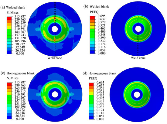 Figure 9 shows the comparisons of typical distributions of equivalent stress and strain at welded and homogeneous workpieces during power spinning. It can be found that the welded and homogeneous workpieces present a very close distribution feature in BMZ. Both of equivalent stress and strain present the annular distribution feature. Moreover, they both increase with the radial direction and reach the maximum in the annular zone behind roller. These features are the same as those in the common power spinning of the curved head, which have been explained in reference [10]. However, the distributions of equivalent stress and strain in WZ are quite different from the BMZ, as shown in Figure 9a,b. The WZ presents larger stress but smaller strain than BMZ. As shown in Figure 2, the deformation resistance of WZ is greater than BMZ, thus the equivalent stress in WZ is larger. As for the distribution feature of equivalent strain near WZ, it will be analyzed in detail below.