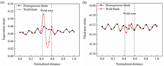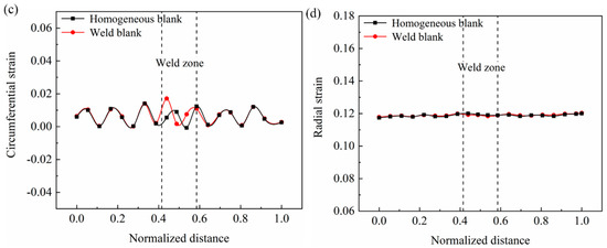 Figure 10 shows the circumferential distributions of equivalent strain and strain components near WZ. It can be seen from Figure 10a that the distribution of equivalent strain near WZ presents a V-shaped feature. The equivalent strains at two boundaries between WZ and BMZ are larger than the values of the homogeneous workpiece. While the equivalent strain at the middle of WZ is smaller than that of the homogeneous workpiece. In addition, it should be noted that the distribution of equivalent strain in WZ is asymmetric. The left boundary presents a larger strain than the right boundary, as shown in Figure 10a. From the distributions of three strain components (Figure 10b–d), it can be seen that thickness and circumferential strains both present a similar distribution feature to equivalent strain, i.e., larger at boundaries and smaller at the center. However, the radial strain changes little near WZ and is very close to that of the homogeneous workpiece. These suggest that the V-shaped distribution of equivalent strain near WZ is mainly caused by the thickness and circumferential strains, while little related to the radial strain.