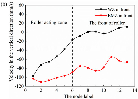 To explain the V-shaped distribution feature of equivalent strain, the deformation behavior near WZ was analyzed. Figure 11a shows the schematic of deformation behavior when the roller is about to contact the WZ. The material in the roller acting zone will move in the vertical direction and deform, meanwhile, the material in front of the roller will also passively move vertically a little. They will restrain each other. Figure 11b shows the distribution of vertical velocity in the deformation region under different conditions. It can be observed that when encounters BMZ, the velocity in the front of the roller is close to that in the roller acting zone. However, when encountering the WZ, the velocity in front of the roller is much smaller than that in the roller acting zone and close to 0. This is because the deformation resistance of WZ is larger than that of BMZ, which will lead to larger resistance to the passive vertical movement. This discordant movement caused by incompatible deformability in two zones will cause larger equivalent strain at the boundary between BMZ and WZ, i.e., the left boundary in Figure 10a. On the contrary, when the roller moves from WZ to BMZ, the BMZ in front of the roller possesses good deformability, which can coordinate the deformation in the roller acting zone. Thus, the equivalent strain at the right boundary in Figure 10a is smaller than that at the left boundary, presenting the asymmetric features. On the other hand, when the whole deformation region locates in WZ, the deformability difference between the roller acting zone and front of the roller is very small. Moreover, the deformation resistance of WZ is larger than that of BMZ. Thus, the equivalent strain in the center of WZ is smaller than that in BMZ.