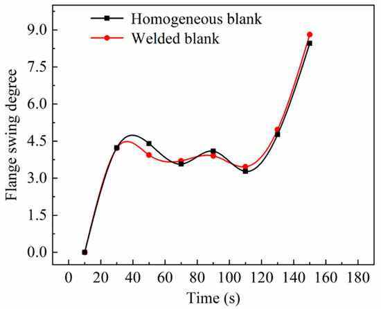 As well known, the flange state plays a great role in the forming quality during spinning. Thus, the flange swing degree (FSD) during the forming process is also analyzed, which is evaluated by the difference between the peak and valley points on the flange. From Figure 13, it can be found that FSD first increases quickly, then change little, and increases quickly again in the last forming stage. This variation trend is very close to that of DI in Figure 12, which suggests that the deformation inhomogeneity has an important effect on the FSD. Besides, it can be seen that the FSD is very close to the spinning of the welded and homogeneous blank. It indicates that the inhomogeneous material properties of welded blank do not intensify the FSD in this work.