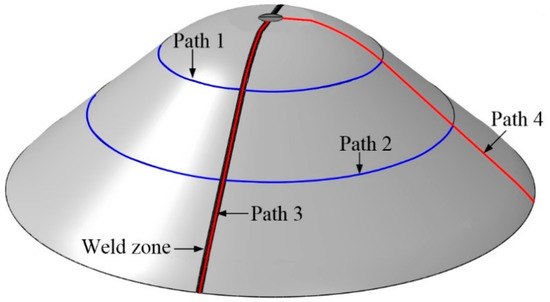 As the wall thickness and unfitability are two critical indexes for the forming quality of power spinning, their distributions in four typical paths on the workpiece were analyzed in this section. Figure 14 shows the typical analysis paths. Path 1 and 2 are two circumferential paths in the arc and linear segments, respectively. Path 3 and 4 are two radial paths along WZ and its perpendicular direction, respectively.