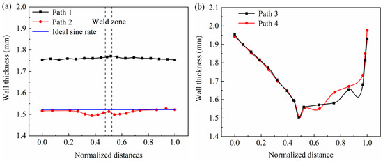 Figure 15a,b shows the wall thickness distribution along typical circumferential and radial paths, respectively. It can be seen that the wall thickness at two circumferential paths are both close to the ideal sine reduction rate. In addition, the wall thickness distribution is almost uniform in the circumferential direction, except for a slight fluctuation near the WZ. The wall thickness in the WZ presents an approximate ∧-shaped distribution. The thicknesses near the boundaries are smaller than that in the BMZ, but those in the center are greater. This is caused by the V-shaped inhomogeneous distribution of equivalent strain in the WZ, as described in Section 3.1. There is an obvious negative correlation between wall thickness and equivalent strain. However, it should be noted that this thickness fluctuation is very small compared to the thickness variation in the radial direction. As shown in Figure 15b, the wall thickness in the WZ (Path 3) and BMZ (Path 4) are very close. This suggests that as far as the wall thickness be considered, the existence of WZ hardly affects the thickness homogeneous. As for the dramatic increase of thickness at the edge of the component, it has also been found in the work of [10], which is a common phenomenon in the power spinning. This is because the flange width is very small at the final forming stage, which makes the flange fluctuate greatly and present a very small constraint effect. Under these effects, the deformation mode will deviate the ideal shear deformation. Thus, the wall thickness increases dramatically at the edge of the component. However, this part can be cut after forming, which has little effect on the forming quality.