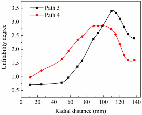 where, (x, y, z) is the coordinate of node i and ti is the thickness at node i. The first and second equations are applied to the arc and linear segments, respectively. Figure 16 shows the distribution of UD along radial paths. It can be found that the UD increases first then decreases for both radial paths. Besides, it can be observed that the UD in the WZ (Path 3) is larger than that in the BMZ (Path 4) for smaller radial distances, while it gets smaller for larger radial distances. These indicate that the existence of the weld line leads to the non-uniformity of UD in the circumferential direction, which will also worsen the roundness of formed components to some extent.