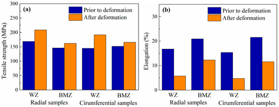 In this section, the microstructure and mechanical properties of spinning formed components are analyzed. The microstructure was observed with the magnification of 500× using an optical microscope. Figure 17 shows the initial and deformed microstructure in the BMZ and WZ. It can be seen that the aspect ratio of grains in deformed microstructure is much greater than the initial microstructure for both of the BMZ and WZ. This is caused by the significant shear deformation in power spinning. The significant microstructure change will affect the final mechanical properties. Besides, it can be observed that the deformed microstructure in the WZ and BMZ are quite different, which may lead to the inhomogeneous distribution of mechanical property in the formed workpiece. Thus, the mechanical properties in BMZ and WZ are tested along the circumferential and radial directions, respectively. Figure 18 shows the detailed four sampling locations for tensile tests. The tensile sample size and test scheme were conducted according to the standard method. The tensile samples were cut by the wire-cutting machine, flattened, and ground. The tensile tests were performed on the NCS GNT100 universal tensile test machine. After tests, the tensile strength and elongation were obtained, and the microscope fracture morphology was observed with the magnification of 500× using a scanning electron microscope.